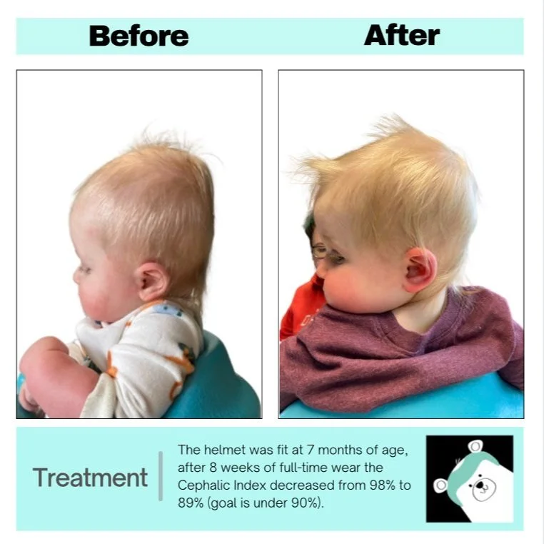 We snap a few pictures of the “before” head shape to utilize in the event that a family chooses to pursue treatment. We find these helpful as treatment progresses to monitor progress, and also love a good “before and after” comparison once treatment is done!